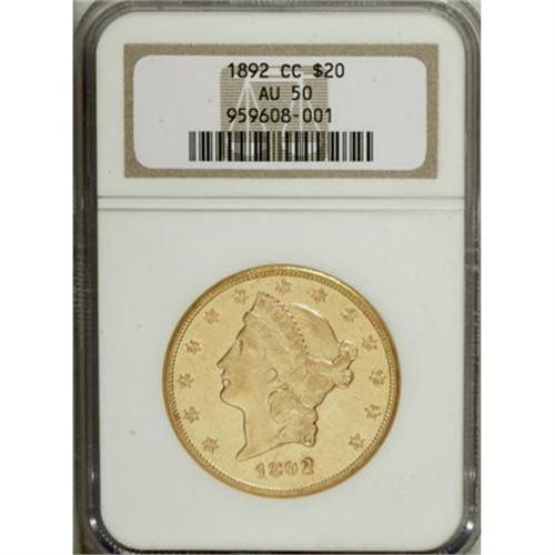 <B>1892-CC $20 AU50 NGC.</B></I> A well-defined, briefly circulated representative that retains plenty of flash in the yellow-orange fields. Despite a number of marks in the fields, the portrait is clean for the issue and the grade.<BR><I>From The Vanek Collection.</B></I><BR><BR><b>Shipping:</b> Coins & Currency (<a target="_blank" href="http://www.heritageauctions.com/common/shipping.php">view shipping information</a>)