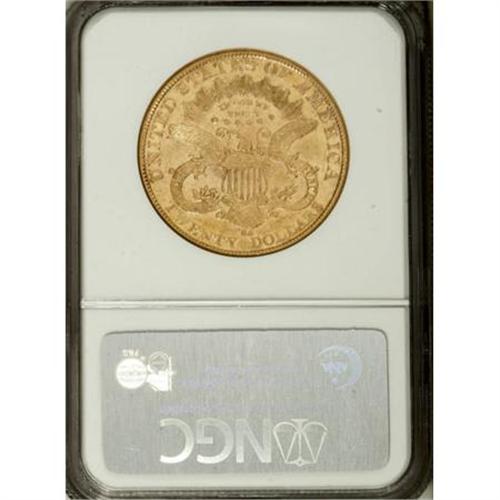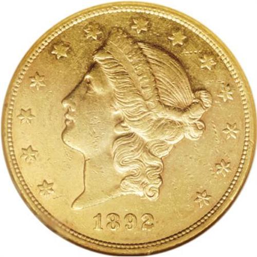 <B>1892-CC $20 AU55 NGC.</B></I> Considerable semi-prooflike luster brightens this charming Carson City double eagle. The upper obverse stars are softly impressed, but the devices display only slight wear. A few marks near obverse star 12 fail to distract. The 1892-CC is less rare than the 1891-CC or 1893-CC, but is significantly scarcer than the 1890-CC.<BR><BR><b>Shipping:</b> Coins & Currency (<a target="_blank" href="http://www.heritageauctions.com/common/shipping.php">view shipping information</a>)