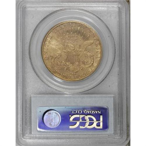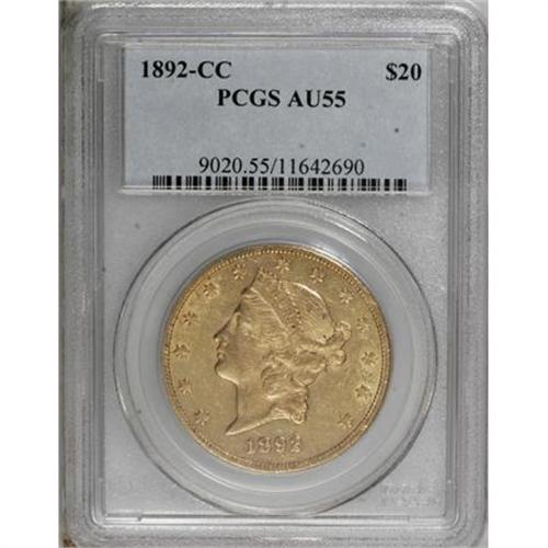 <B>1892-CC $20 AU55 PCGS.</B></I> A briefly circulated representative from the penultimate Carson City double eagle issue, this 1892-CC piece has boldly impressed, lightly worn devices that show a handful of copper spots. Scattered abrasions appear in the brassy fields.<BR><BR><b>Shipping:</b> Coins & Currency (<a target="_blank" href="http://www.heritageauctions.com/common/shipping.php">view shipping information</a>)