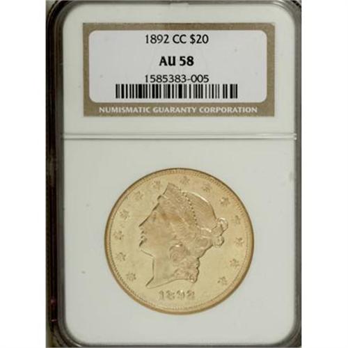 <B>1892-CC $20 AU58 NGC.</B></I> While the 1892-CC double eagle comes with a relatively small mintage of 27,265 pieces, Jeff Garrett and Ron Guth (2006) note that in the last decade or so several important groups of this date have surfaced from overseas, increasing the supply of high-grade pieces. The AU58 specimen in this lot exhibits nice contrast between the sharply struck motifs and the partially prooflike fields. The light marks scattered over both sides do not take away from the coin's overall eye appeal.<BR><BR><B>Coin Engraver:</B> James B. Longacre<BR><BR><b>Shipping:</b> Coins & Currency (<a target="_blank" href="http://www.heritageauctions.com/common/shipping.php">view shipping information</a>\)