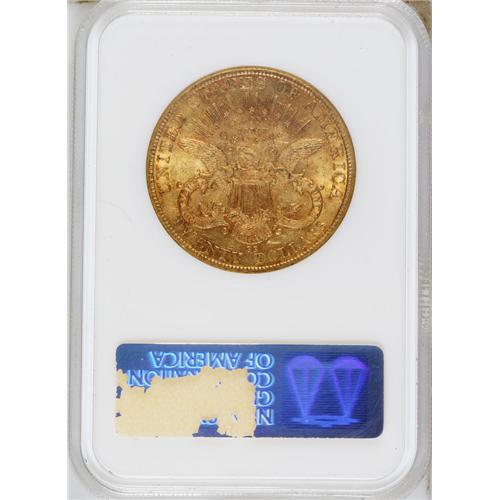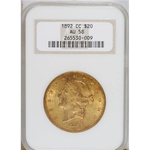 <B>1892-CC $20 AU58 NGC.</B></I> A pleasing near-Mint example of this popular Carson City double eagle, this piece has lustrous green-gold surfaces with hints of orange toning and dark steel color that testifies to its original nature. At one time, this date was considered a prime rarity, but several small holdings have entered the market place in recent years.<BR><BR><b>Shipping:</b> Coins & Currency (<a target="_blank" href="http://www.heritageauctions.com/common/shipping.php">view shipping information</a>)