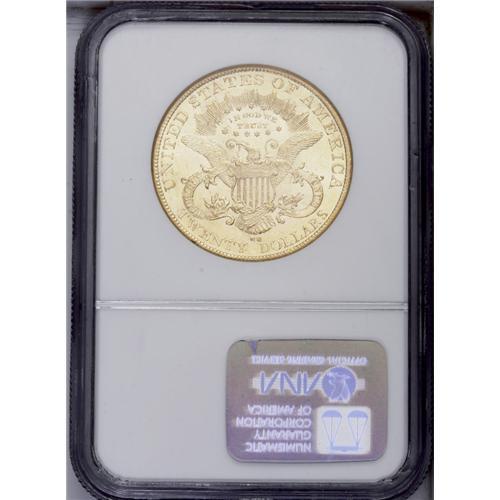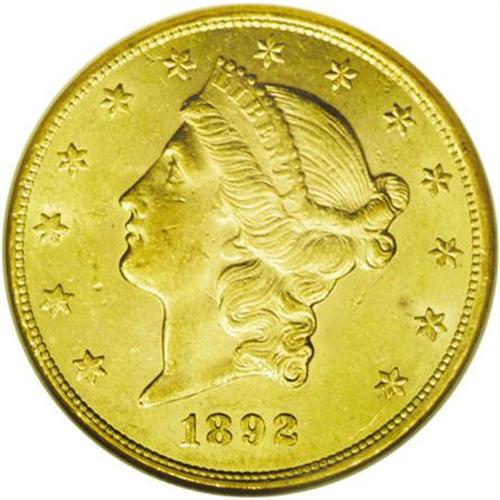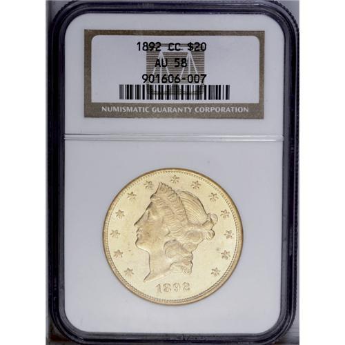 <B>1892-CC<$20> AU58 NGC.</B></I> Considerable remaining luster is evident on the yellow-gold surfaces. Sharply struck, with a few small marks noted on the obverse. Always a popular CC issue.