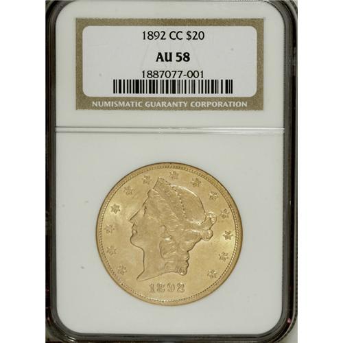 1892-CC $20 AU58 NGC. The 1892-CC, with a mintage of 2