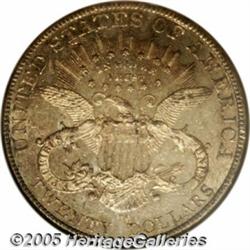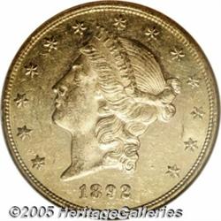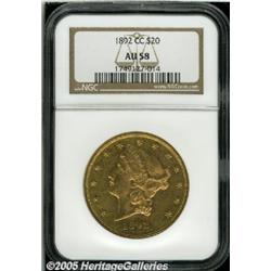 <B>1892-CC $20 AU58 NGC.</B></I> The prooflike surfaces are mildly dulled by some light abrasions in the fields. Liberty's cheek is a bit dark, but otherwise the coin is brilliant and retains a lot of its original luster.