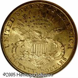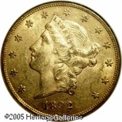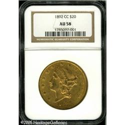 <B>1892-CC $20 AU58 NGC.</B></I> This coin must have circulated for only a brief time. The surfaces are very nice for a Carson City gold coin, without the usual deep or distracting handling marks and nicks, just a scattering of minor nicks are seen. Touches of darker colors are found on the high points of the design. Lot:9232