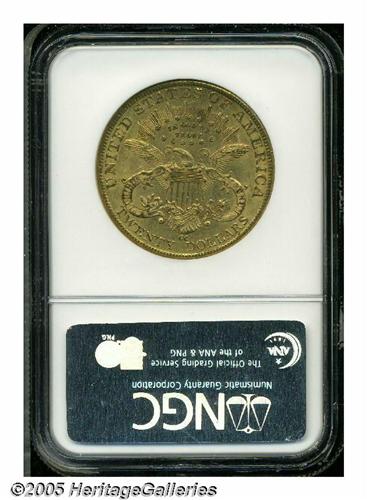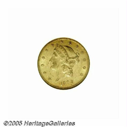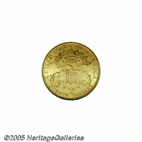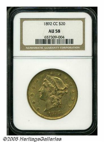 <B>1892-CC<$20> AU58 NGC.</B></I> This relatively low mintage (27,265 pieces) Carson City example is close to Mint State condition, exhibiting slight wear and a somewhat dirty appearance on the highpoints. The design elements are nicely struck up, save for softness in the lower left obverse stars. A few light abrasions are scattered about, but none are individually serious.