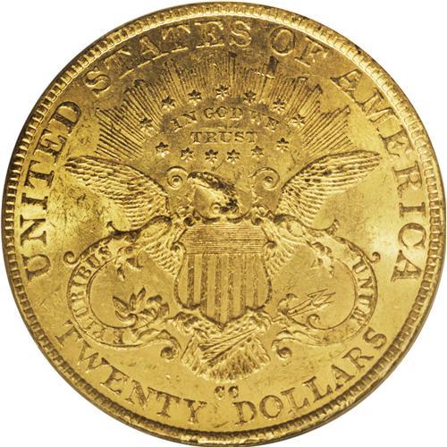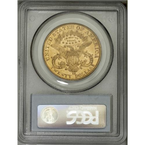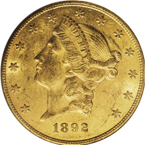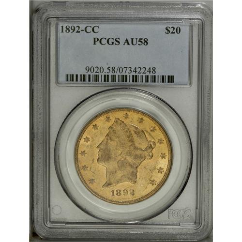 <B>1892-CC $20 AU58 PCGS.</B></I> An iridescent slider that knocks on the door of a Mint State grade. Liberty's hair has only a whisper of gray friction, but the fields retain their orange luminescence. Careful examination beneath a loupe fails to locate mentionable marks. A worthy addition to a near-Mint Carson City assemblage.<BR><BR><b>Shipping:</b> Coin/Currency (<a target="_blank" href="http://www.heritageauctions.com/common/shipping.php">view shipping information</a>)