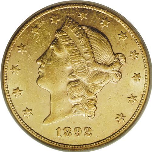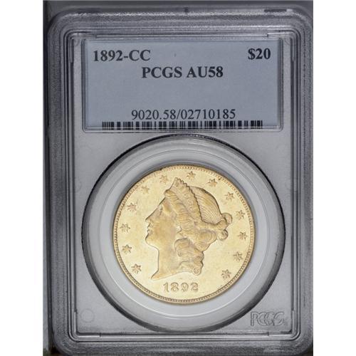 <B>1892-CC $20 AU58 PCGS.</B></I> The 1892-CC issue is usually seen in high-end VF through AU55, but starts to become scarce in high-end AU condition. Doug Winter (2001) writes that the surfaces of this date are nearly always seen with "deep, dense abrasions." The present AU58 example we offer in this lot does have its share of bagmarks, but they are not deep and do not exhibit a dense spatial distribution. Moreover, the design features are well brought up, and the bright yellow-gold faces retain ample luster. Truly a nice representative of this issue.<BR><BR><b>Shipping:</b> Coin/Currency (<a target="_blank" href="http://www.heritageauctions.com/common/shipping.php">view shipping information</a>)
