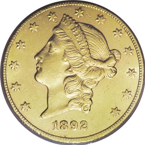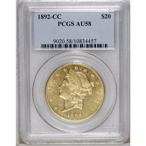 <B>1892-CC $20 AU58 PCGS.</B></I> The discovery of a couple of hoards over the past 10 years has made the 1892-CC a more available coin than it formerly was. That is good news for collectors as the '92-CC is now available at a reasonable price and in relatively high grade (for a Carson City twenty). This is an appealing coin that retains most of the original prooflike finish in the fields on each side. Sharply struck throughout, the surfaces are bright yellow-gold, and there are no singularly mentionable marks present.<BR><BR><b>Shipping:</b> Coin/Currency (<a target="_blank" href="http://www.heritageauctions.com/common/shipping.php">view shipping information</a>)
