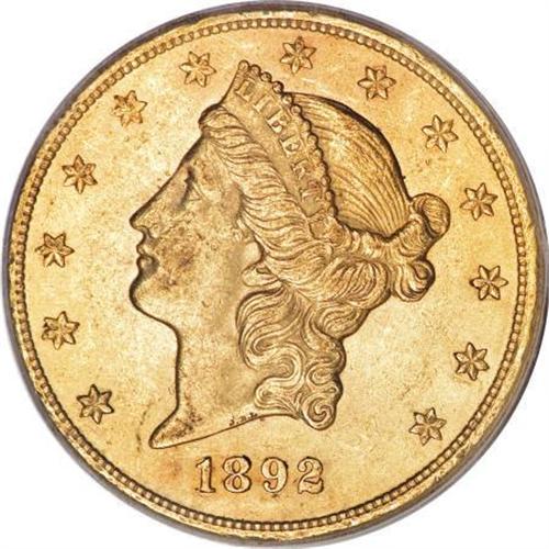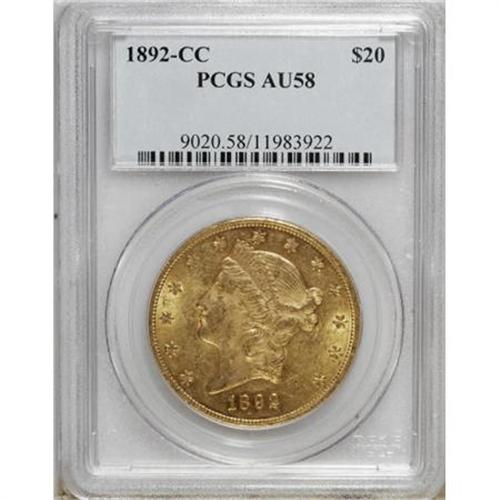 <B>1892-CC $20 AU58 PCGS.</B></I> Dusky grayish patina remains over lustrous yellow surfaces. Traces of faint orange toning can be seen, especially on the reverse. This coin, like so many others, retains its original appearance from years in storage, perhaps in Europe or South America.<BR><BR><B>Coin Engraver:</B> James B. Longacre<BR><BR><b>Shipping:</b> Coins & Currency (<a target="_blank" href="http://www.heritageauctions.com/common/shipping.php">view shipping information</a>)