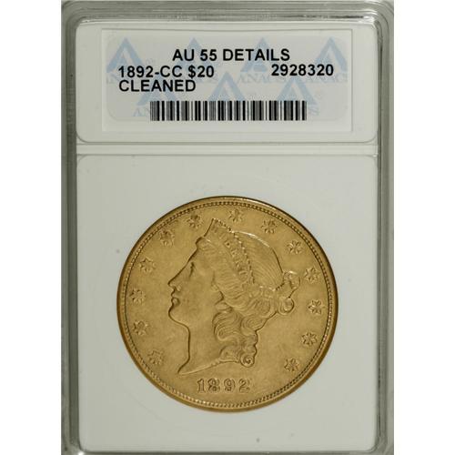 <B>1892-CC $20 --Cleaned--ANACS. AU55 Details.</B></I> Variety 1-A. The fields and devices are surprisingly clean for this issue, though the surfaces show signs of abrasive cleaning. Yellow-gold overall with cloudiness and incrustation at the reverse periphery.<BR><BR><b>Shipping:</b> Coins & Currency (<a target="_blank" href="http://www.heritageauctions.com/common/shipping.php">view shipping information</a>)