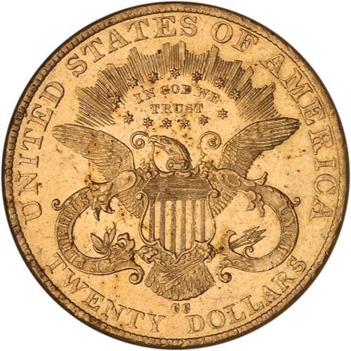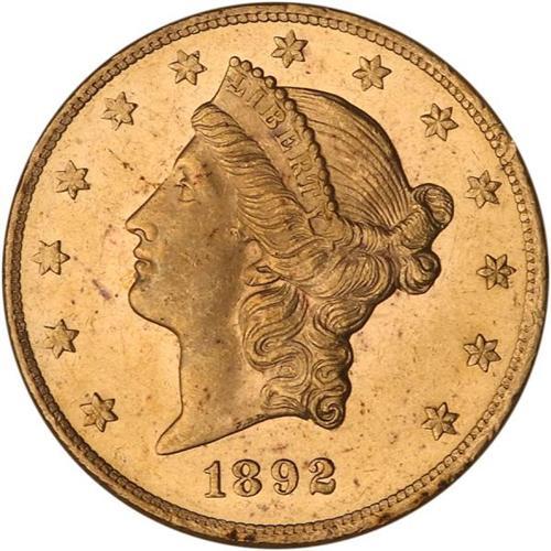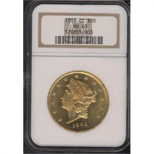 <b>1892-CC $20 Liberty. NGC graded MS63.</b> NGC Pop: 5/0. A satiny to semi-prooflike specimen of this very elusive CC-mint $20 gold piece, high-end choice quality with energetic cartwheel luster. The luster is golden brilliant rather than orange-toned patina. Such flashiness seems to want to motivate bidders to increase their bids as though by subtle hypnotism! Only 27,265 pieces minted. The average grade, when this date is offered at all (which isn't often) tends to migrate around Extremely Fine condition.