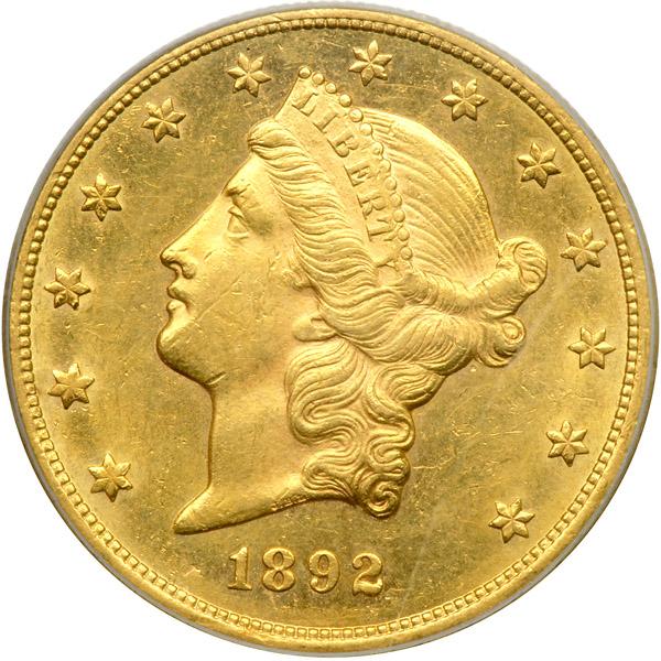 1892-CC $20 Liberty. PCGS graded AU-58. Toned with semi-reflective surfaces surrounding frosty devices. Scarcely ever found this choice. We note a single little nick on the throat area and a minor tick at the eyelid. A little roughness around IN GOD WE TRUST is also not unexpected. Only 27,265 struck. Pop 84; 112 finer, 20 in 60, 43 in 61, 43 in 62, 1 in 62+, 5 in 63 (PCGS # 9020) .