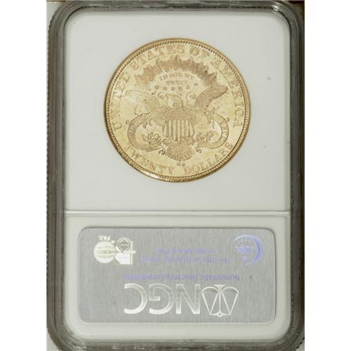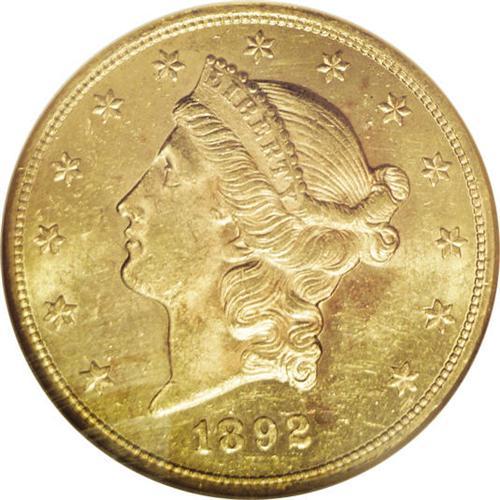 <B>1892-CC $20 MS61 NGC.</B></I> Formerly considered quite rare, this issue has seen numerous repatriations that enabled collectors to acquire a nice Mint State piece up to MS62 or so. Regardless, the average example grades no higher than AU55. The present piece offers fairly prooflike brilliance emanating from the peach-gold fields, which also show a bit of field chatter and light, scattered abrasions. Choice for the grade.<BR><BR><b>Shipping:</b> Coin/Currency (<a target="_blank" href="http://www.heritageauctions.com/common/shipping.php">view shipping information</a>)