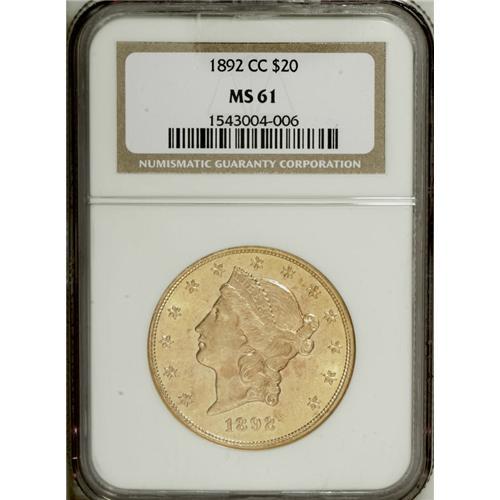 1892-CC $20 MS61 NGC. Formerly considered quite rare,