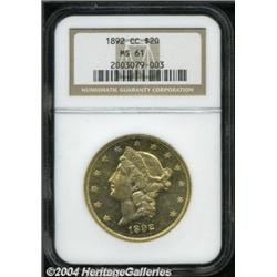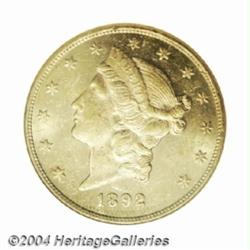 <table><tbody><tr><td><table> <TR><TD width="100%"><TABLE cellSpacing=1 cellPadding=3 width="100%" border=0><TBODY><TR><TD width="100%" bgColor=#79735c><FONT face=arial color=#ffffff size=3><B>Description</B> </FONT></TD></TR><TR><TD width="100%" bgColor=#ffffff><FONT face=arial size=2><B>1892-CC $20 MS61 NGC.</B></I> The 1892-CC is now considered one of the more plentiful double eagles because of a hoard that appeared on the market a few years ago. However, only 70-80 coins are probably available in Uncirculated grades, hardly a common coin in an absolute sense but definitely obtainable for the Carson City collector. The fields are bright and shimmer with prooflike reflectivity. The sheen in the fields is only interrupted by the numerous small abrasions that account for the coin's grade.<BR><I>From a Magnificent Collection of Double Eagles.</B></I> </FONT></TD></TR></TBODY></TABLE></TD></TR></TBODY></TABLE><BR><A name=PricesRealized></A><TABLE cellSpacing=0 cellPadding=0 width="100%" bgColor=#000000 border=0><TBODY><TR><TD width="100%"><TABLE cellSpacing=1 cellPadding=3 width="100%" border=0><TBODY><TR><TD width="100%" bgColor=#79735c><A name=PR><FONT face=arial color=#ffffff size=3><B>Previous Prices from Heritage Auctions</B> </FONT></A></TD></TR><TR><TD bgColor=#f6f6ed><TABLE cellSpacing=0 cellPadding=0 width="100%" border=1><TBODY><TR><TD align=middle width="33%"><B>Date</B></TD><TD align=middle width="33%"><B>Service</B></TD><TD align=middle width="33%"><B>Price</B></TD></TR><TR bgColor=whitesmoke><TD width="33%"><B>03/26/2002</B></TD><TD width="33%">NGC</TD><TD width="33%">$3,565.00</TD></TR><TR bgColor=whitesmoke><TD width="33%"><B>11/07/2003</B></TD><TD width="33%">PCGS</TD><TD width="33%">$7,762.50</TD></TR><TR bgColor=whitesmoke><TD width="33%"><B>09/28/2002</B></TD><TD width="33%">PCGS</TD><TD width="33%">$3,795.00</TD></TR><TR bgColor=whitesmoke><TD width="33%"><B>01/06/1996</B></TD><TD width="33%">NGC</TD><TD width="33%">$2,310.00</TD></TR><TR bgColor=whitesmoke><TD width="33%"><B>05/01/2000</B></TD><TD width="33%">NGC</TD><TD width="33%">$2,500.00</TD></TR><TR bgColor=whitesmoke><TD width="33%"><B>10/01/1998</B></TD><TD width="33%">PCGS</TD><TD width="33%">$4,400.00</TD></TR><TR bgColor=whitesmoke><TD width="33%"><B>01/01/1996</B></TD><TD width="33%">PCGS</TD><TD width="33%">$2,200.00</TD></TR><TR bgColor=whitesmoke><TD width="33%"><B>03/01/1991</B></TD><TD width="33%">ANACS</TD><TD width="33%">$3,190.00</TD></TR></TBODY></TABLE></TD></TR><TR><TD bgColor=#ffffff><FONT face=arial size=1 ?>PLEASE NOTE: All prices realized reflect the final hammer price PLUS the buyer's premium in auctions that charge a buyer's premium. Each item has a notation at the top of the listing indicating whether that lot included a buyer's premium. Example: A item that sells with a final hammer price of $100 and a 20% buyer's premium will display with a price realized of $120. All information listed is intended to be as accurate as possible, but errors are possible. Please use this guide carefully and inform us of any inaccuracies. </FONT></TD></TR></TBODY></TABLE></TD></TR></TBODY></TABLE><BR><TABLE cellSpacing=0 cellPadding=0 width="100%" bgColor=#000000 border=0><TBODY><TR><TD width="100%"><TABLE cellSpacing=1 cellPadding=3 width="100%" border=0><TBODY><TR><TD width="100%" bgColor=#79735c colSpan=6><FONT face=arial color=#ffffff size=3><B>Price Guide*</B> </FONT></TD></TR><TR bgColor=#f6f6ed><TD align=middle><B>Grade</B> </TD><TD align=middle><B>Coin World<BR>(Trends)</B> </TD><TD align=middle><B>Numismedia<BR>Retail</B> </TD><TD align=middle><B>Numismedia<BR>Wholesale</B> </TD><TD align=middle><B>Coin<BR>Universe</B> </TD><TD align=middle><B>Heritage<BR>Value Index</B> </TD></TR><TR bgColor=#ffffff><TD align=middle>60</TD><TD align=right>$3,500.00</TD><TD align=right>---</TD><TD align=right>$2,175.00</TD><TD align=right>$2,975.00</TD><TD align=right>$2,200.83</TD></TR><TR style="FONT-WEIGHT: bold" bgColor=#cccfdd><TD align=middle>61</TD><TD align=right>---</TD><TD align=right>---</TD><TD align=right>$3,525.00</TD><TD align=right>$3,750.00</TD><TD align=right>$3,777.50</TD></TR><TR bgColor=#ffffff><TD align=middle>62</TD><TD align=right>$8,000.00</TD><TD align=right>---</TD><TD align=right>$6,925.00</TD><TD align=right>$8,650.00</TD><TD align=right>$5,751.25</TD></TR><TR bgColor=#ffffff><TD colSpan=6><FONT size=1>*All information listed is intended to be as accurate as possible, but errors are possible. No item may be returned or refused based on this information which is provided as a service to our customers. You should contact each pricing source directly to determine the accuracy of this information. </FONT></TD></TR></TBODY></TABLE></TD></TR></TBODY></TABLE><BR><TABLE cellSpacing=0 cellPadding=0 width="100%" bgColor=#000000 border=0><TBODY><TR><TD width="100%"><TABLE cellSpacing=1 cellPadding=3 width="100%" border=0><TBODY><TR><TD width="100%" bgColor=#79735c><FONT face=arial color=#ffffff size=3><B>Population Guide</B> </FONT></TD></TR><TR bgColor=#ffffff><TD align=middle><!-- Begin Output of Population Grid--><TABLE cellSpacing=0 cellPadding=0 width="100%" border=0><TBODY><TR><TD vAlign=center><TABLE cellSpacing=0 width="100%" border=1 cellsadding="3"><TBODY><TR><TD vAlign=center><TABLE cellSpacing=0 cellPadding=3 width="100%" border=1><TBODY><TR><TD vAlign=center align=middle bgColor=#f0f1e8 colSpan=2 <CENTER><FONT face=Arial size=2><B>PCGS Pop </B></FONT><CENTER></CENTER></TD><TD vAlign=center align=middle bgColor=#f0f1e8 colSpan=2><CENTER><FONT face=Arial size=2><B>NGC Pop</B></CENTER></FONT></TD></TR><TR><TD vAlign=center><FONT face=Arial size=2>(61)</FONT> </TD><TD vAlign=center align=right><FONT face=Arial size=2>28</FONT> </TD><TD vAlign=center><FONT face=Arial size=2>(61)</FONT> </TD><TD vAlign=center align=right><FONT face=Arial size=2>50</FONT> </TD></TR><TR><TD vAlign=center><FONT face=Arial size=2>(>61)</FONT> </TD><TD vAlign=center align=right><FONT face=Arial size=2>38</FONT>