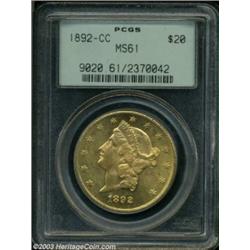 <table><tr><td><TABLE cellSpacing=0 cellPadding=0 width="100%" bgColor=#000000 border=0><TBODY> <TR><TD width="100%"><TABLE cellSpacing=1 cellPadding=3 width="100%" border=0><TBODY><TR><TD width="100%" bgColor=#79735c><FONT face=arial color=#ffffff size=3><B>Description</B> </FONT></TD></TR><TR><TD width="100%" bgColor=#ffffff><FONT face=arial size=2><B>1892-CC $20 MS61 PCGS.</B></I> Solidly graded at the BU level, this lovely example is awash in dominant orange-gold color, and swirling mint frost is seen throughout. What makes this coin truly attractive, however, are its bright, semi-prooflike surfaces. While the coin has good cartwheel luster, the fields are also mildly reflective. The bold strike is free of criticism, as are the surfaces (which are relatively free of sizeable distractions for the assigned grade). An attractive survivor of an issue that is known for beautiful color and luster quality. Population: 30 in 61, 27 finer (9/03). </FONT></TD></TR></TBODY></TABLE></TD></TR></TBODY></TABLE><BR><A name=PricesRealized></A><TABLE cellSpacing=0 cellPadding=0 width="100%" bgColor=#000000 border=0><TBODY><TR><TD width="100%"><TABLE cellSpacing=1 cellPadding=3 width="100%" border=0><TBODY><TR><TD width="100%" bgColor=#79735c><A name=PR><FONT face=arial color=#ffffff size=3><B>Previous Prices from Heritage Auctions</B> </FONT></A></TD></TR><TR><TD bgColor=#f6f6ed><TABLE cellSpacing=0 cellPadding=0 width="100%" border=1><TBODY><TR><TD align=middle width="33%"><B>Date</B></TD><TD align=middle width="33%"><B>Service</B></TD><TD align=middle width="33%"><B>Price</B></TD></TR><TR bgColor=whitesmoke><TD width="33%"><B>03/26/2002</B></TD><TD width="33%">NGC</TD><TD width="33%">$3,565.00</TD></TR><TR bgColor=whitesmoke><TD width="33%"><B>09/28/2002</B></TD><TD width="33%">PCGS</TD><TD width="33%">$3,795.00</TD></TR><TR bgColor=whitesmoke><TD width="33%"><B>01/06/1996</B></TD><TD width="33%">NGC</TD><TD width="33%">$2,310.00</TD></TR><TR bgColor=whitesmoke><TD width="33%"><B>05/01/2000</B></TD><TD width="33%">NGC</TD><TD width="33%">$2,500.00</TD></TR><TR bgColor=whitesmoke><TD width="33%"><B>10/01/1998</B></TD><TD width="33%">PCGS</TD><TD width="33%">$4,400.00</TD></TR><TR bgColor=whitesmoke><TD width="33%"><B>01/01/1996</B></TD><TD width="33%">PCGS</TD><TD width="33%">$2,200.00</TD></TR><TR bgColor=whitesmoke><TD width="33%"><B>03/01/1991</B></TD><TD width="33%">ANACS</TD><TD width="33%">$3,190.00</TD></TR></TBODY></TABLE></TD></TR><TR><TD bgColor=#ffffff><FONT face=arial size=1 ?>PLEASE NOTE: All prices realized reflect the final hammer price PLUS the buyer's premium in auctions that charge a buyer's premium. Each item has a notation at the top of the listing indicating whether that lot included a buyer's premium. Example: A item that sells with a final hammer price of $100 and a 20% buyer's premium will display with a price realized of $120. All information listed is intended to be as accurate as possible, but errors are possible. Please use this guide carefully and inform us of any inaccuracies. </FONT></TD></TR></TBODY></TABLE></TD></TR></TBODY></TABLE><BR><TABLE cellSpacing=0 cellPadding=0 width="100%" bgColor=#000000 border=0><TBODY><TR><TD width="100%"><TABLE cellSpacing=1 cellPadding=3 width="100%" border=0><TBODY><TR><TD width="100%" bgColor=#79735c colSpan=6><FONT face=arial color=#ffffff size=3><B>Price Guide*</B> </FONT></TD></TR><TR bgColor=#f6f6ed><TD align=middle><B>Grade</B> </TD><TD align=middle><B>Coin World<BR>(Trends)</B> </TD><TD align=middle><B>Numismedia<BR>Retail</B> </TD><TD align=middle><B>Numismedia<BR>Wholesale</B> </TD><TD align=middle><B>Coin<BR>Universe</B> </TD><TD align=middle><B>Heritage<BR>Value Index</B> </TD></TR><TR bgColor=#ffffff><TD align=middle>60</TD><TD align=right>$3,500.00</TD><TD align=right>---</TD><TD align=right>$2,175.00</TD><TD align=right>$2,975.00</TD><TD align=right>$2,200.63</TD></TR><TR style="FONT-WEIGHT: bold" bgColor=#cccfdd><TD align=middle>61</TD><TD align=right>---</TD><TD align=right>---</TD><TD align=right>$3,525.00</TD><TD align=right>$3,450.00</TD><TD align=right>$4,255.00</TD></TR><TR bgColor=#ffffff><TD align=middle>62</TD><TD align=right>$8,000.00</TD><TD align=right>---</TD><TD align=right>$6,950.00</TD><TD align=right>$8,650.00</TD><TD align=right>$7,236.25</TD></TR><TR bgColor=#ffffff><TD colSpan=6><FONT size=1>*All information listed is intended to be as accurate as possible, but errors are possible. No item may be returned or refused based on this information which is provided as a service to our customers. You should contact each pricing source directly to determine the accuracy of this information. </FONT></TD></TR></TBODY></TABLE></TD></TR></TBODY></TABLE><BR><TABLE cellSpacing=0 cellPadding=0 width="100%" bgColor=#000000 border=0><TBODY><TR><TD width="100%"><TABLE cellSpacing=1 cellPadding=3 width="100%" border=0><TBODY><TR><TD width="100%" bgColor=#79735c><FONT face=arial color=#ffffff size=3><B>Population Guide</B> </FONT></TD></TR><TR bgColor=#ffffff><TD align=middle><!-- Begin Output of Population Grid--><TABLE cellSpacing=0 cellPadding=0 width="100%" border=0><TBODY><TR><TD vAlign=center><TABLE cellSpacing=0 width="100%" border=1 cellsadding="3"><TBODY><TR><TD vAlign=center><TABLE cellSpacing=0 cellPadding=3 width="100%" border=1><TBODY><TR><TD vAlign=center align=middle bgColor=#f0f1e8 colSpan=2 <CENTER><FONT face=Arial size=2><B>PCGS Pop </B></FONT><CENTER></CENTER></TD><TD vAlign=center align=middle bgColor=#f0f1e8 colSpan=2><CENTER><FONT face=Arial size=2><B>NGC Pop</B></CENTER></FONT></TD></TR><TR><TD vAlign=center><FONT face=Arial size=2>(61)</FONT> </TD><TD vAlign=center align=right><FONT face=Arial size=2>28</FONT> </TD><TD vAlign=center><FONT face=Arial size=2>(61)</FONT> </TD><TD vAlign=center align=right><FONT face=Arial size=2>47</FONT> </TD></TR><TR><TD vAlign=center><FONT face=Arial size=2>(>61)</FONT> </TD><TD vAlign=center align=right><FONT face=Arial size=2>38</FONT> </TD><TD vAlign=center><FO