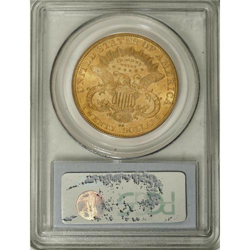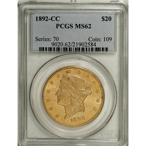 <B>1892-CC $20 MS62 PCGS.</B></I> Although it is not the finest certified example, this lovely Mint State coin is clearly finer than most. The surfaces are fully brilliant with lovely yellow-gold color and the design elements are generally well struck. Both sides have the usual abrasions that are expected at the grade level. Perhaps the most important aspect of this piece is the luster, with its reflective fields and prooflike appearance. The advanced collector of Carson City gold will recognize that this particular example is a highly desirable representative. Population: 39 in 62, 4 finer (3/07).<BR><BR><b>Shipping:</b> Coins & Currency (<a target="_blank" href="http://www.heritageauctions.com/common/shipping.php">view shipping information</a>)
