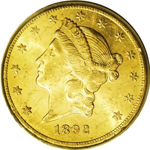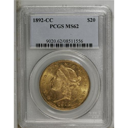 <B>1892-CC<$20> MS62 PCGS.</B></I> This attractive Carson City Mint double eagle is one of a moderate number of similarly graded pieces that are close to the finest pieces known. For the specialist who has been unsuccessful in his or her quest for the finest possible piece, this example may prove to be an excellent alternative. It is sharply struck and highly lustrous with rich yellow-gold color and minimal surface marks on each side. We expect this piece to bring a substantial price in today's marketplace, yet it should prove to be much more affordable than the few higher level Mint State examples. Population: 49 in 62, 5 finer (9/06).