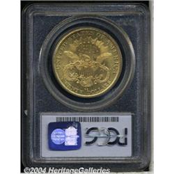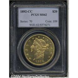 <B>1892-CC<$20> MS62 PCGS.</B></I> Variety 1-A. The base of the 2 in the date is lightly recut. A radiant honey-gold scarcer date Carson City Twenty with a sharp strike and generally clean surfaces. The flashy fields are mildly prooflike. A faint diagonal handling mark at 1 o'clock on the obverse and another below the S in TRUST are not of any importance. A scant 27,265 pieces were struck, and the majority of survivors are in XF to AU grades. Uncirculated examples are very scarce, and tend to come heavily bagmarked due to decades of indifferent shipment and storage. Population: 35 in 62, 4 finer (3/04). <BR><BR><B>Important notice:</B> Heritage usually auctions material at the rate of 200-250 lots per hour. On some occasions eBay Live bid software or the Internet may not be able to keep up with the pace of the auction. We recommend placing a realistic absentee bid now as insurance to avoid disappointment. Occasionally the auctioneer may eliminate or reject an eBay Live bid, and the auctioneer may also reopen a lot after the close of the eBay live bidding (usually because we missed an audience bid), and may reject your bid even if it shows you as the winning bidder. By bidding via eBay Live, you agree that Heritage may award the lot to another bidder at its sole discretion under the circumstances described above or any other reasonable circumstances. Since eBay bids are not shown to us until we open the lot on the floor, we treat those bids just like floor bids. In most cases the floor responds before the eBay bid is presented to us, due to Internet lag time, so for consistency we have made it a policy that floor bids are always considered first over tie eBay live bids. Also please note that all Heritage lots purchased through eBay Live carry a 20% Buyer's Premium. Please make sure you read the Terms and Conditions before you bid. </span></font></tr></table></td></tr></table>
