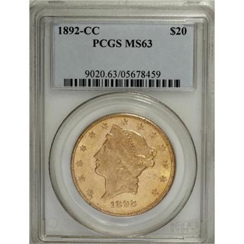 <B>1892-CC $20 MS63 PCGS.</B></I> Douglas Winter, in his <I>Gold Coins of the Carson City Mint</B></I>, writes that of all the Carson City double eagles minted during the 1890s the 1892-CC has had its overall and high-grade rarity adversely impacted by hoards discovered since the mid 1990s. He says "Today, this is among the more available double eagles from this mint."<BR> Winter estimates that 800 to 900 or so 1892-CC twenties are known, usually in Extremely Fine and About Uncirculated grades. The issue is moderately scarce in the lowest Mint State levels of preservation, and becomes very scarce in MS62. MS63 coins are extremely rare, and higher level specimens are virtually unknown. The PCGS/NGC population figures confirm this, showing nine examples in MS63, and none certified finer.<BR> The 1892-CC is typically well struck, and this select example is no exception. A powerful strike imparts bold definition to the design features, including Liberty's hair and the eagle's plumage. Minor softness is visible on the first three stars and the adjacent dentils, which is not unusual. The surfaces are peach-gold tinged with light green, and display pleasing luster. The fields are semi-prooflike to a degree, and offer mild contrast with the motifs. Both sides reveal just a few minute contact marks, certainly fewer and of less severity than usually seen on this heavily bagmarked issue. These attributes combine to give this piece nice overall eye appeal. Population: 4 in 63, 0 finer (3/08).<BR><BR><B>Coin Engraver:</B> James B. Longacre<BR><BR><b>Shipping:</b> Coins & Currency (<a target="_blank" href="http://www.heritageauctions.com/common/shipping.php">view shipping information</a>)