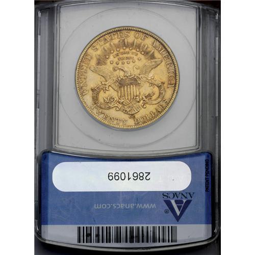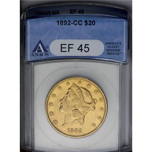 <B>1892-CC<$20> XF45 ANACS.</B></I> A somewhat worn example with orange- and greenish-gold highlights and small scraps of tame luster in hidden fields. An affordable piece of Carson City gold.