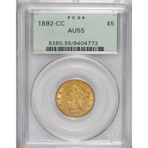 1892-CC $5 AU55 PCGS. PCGS Population (53/112). NG