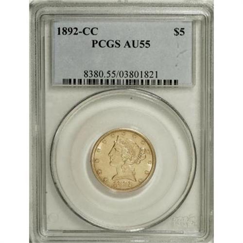 <B>1892-CC $5 AU55 PCGS.</B></I> This Choice AU Carson City five has bright bands of peripheral luster, and the well struck devices display only traces of highpoint friction. The absence of consequential contact further ensures the quality for the grade.<BR><BR><b>Shipping:</b> Coins & Currency (<a target="_blank" href="http://www.heritageauctions.com/common/shipping.php">view shipping information</a>)