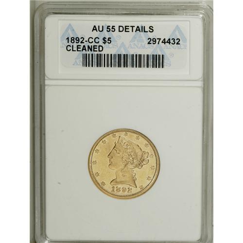 <B>1892-CC $5 --Cleaned--ANACS. AU55 Details.</B></I> NGC Census: (154/518). PCGS Population (52/111). Mintage: 82,968. Numismedia Wsl. Price for NGC/PCGS coin in AU55: $750. (#8380)<BR><BR><b>Shipping:</b> Coins & Currency (<a target="_blank" href="http://www.heritageauctions.com/common/shipping.php">view shipping information</a>)