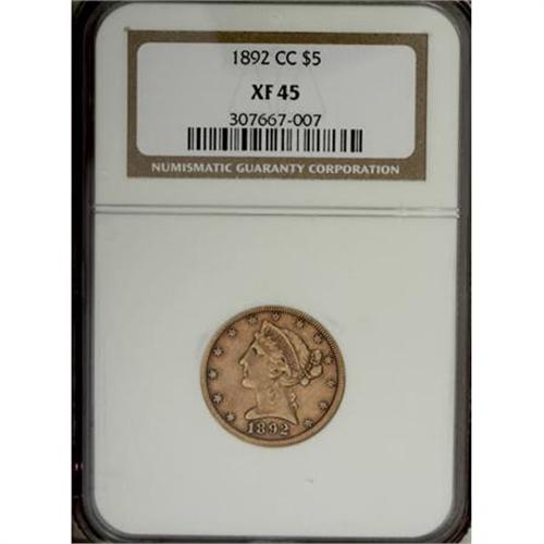 <B>1892-CC $5 XF45 NGC.</B></I> . NGC Census: (59/434). PCGS Population (41/243). Mintage: 82,968. Numismedia Wsl. Price for NGC/PCGS coin in XF45: $403. (#8380)<BR><BR><B>Coin Engraver:</B> Christian Gobrecht<BR><BR><b>Shipping:</b> Coins & Currency (<a target="_blank" href="http://www.heritageauctions.com/common/shipping.php">view shipping information</a>)