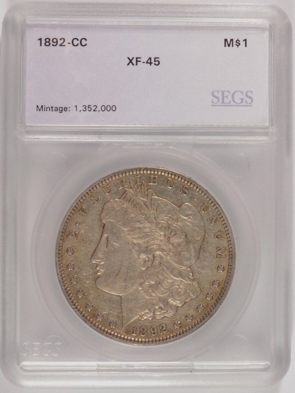 1892-CC MORGAN SILVER DOLLAR, SEGS XF-45 NICE!