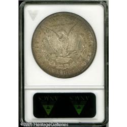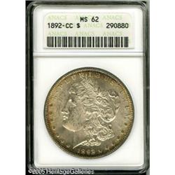 <B>1892-CC<img border='0' src='http://www.heritagecoins.com/images/star.gif' width=10 height=10>$1 MS62 ANACS.</B></I> Most Mint State 1892-CC dollars are heavily bagmarked and exist in grade levels MS60 to MS62. This MS62 specimen has a relatively clean reverse, but reveals light to moderate marks on Liberty's face and hair over the temple. Wisps of golden-brown peripheral toning occur on the obverse, and lilac, gold, and cobalt-blue is seen around the reverse borders. Lot:10382