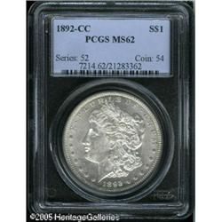<B>1892-CC<img border='0' src='http://www.heritagecoins.com/images/star.gif' width=10 height=10>$1 MS62 PCGS.</B></I> A lightly toned example that has no heavy abrasions. The centers exhibit light mint-made roller marks, but although the strike is not full, the mint luster is undiminished and the reverse is very clean. Lot:10381