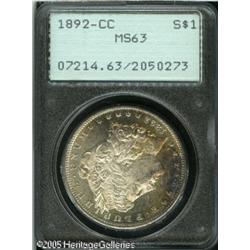 <B>1892-CC<img border='0' src='http://www.heritagecoins.com/images/star.gif' width=10 height=10>$1 MS63 PCGS.</B></I> A well struck and exceedingly frosty coin, with pretty apricot-orange, cobalt-blue, and purple-red toning, on the lower obverse, and a sparkling untoned reverse. Minor scuffiness on the lower obverse, and a single small contact mark on the eagle's breast, limit the grade of the piece. Lot:10384
