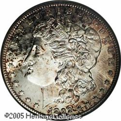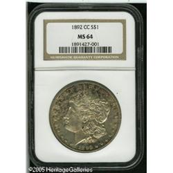 <B>1892-CC<img border='0' src='http://www.heritagecoins.com/images/star.gif' width=10 height=10>$1 MS64 NGC.</B></I> Although overshadowed by its 1893 counterpart, the 1892-CC Morgan Dollar is a prized commodity in the higher levels of Mint State preservation. This is a beautiful, original near-Gem that carries a moderately mottled blanket of russet-brown patination throughout. The smartly impressed surfaces are predominantly smooth and temptingly close to an even higher assessment. This one is a possible candidate for an upgrade. Lot:10387