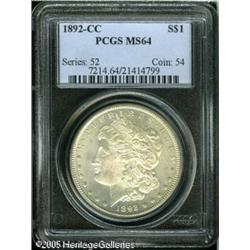 <B>1892-CC<img border='0' src='http://www.heritagecoins.com/images/star.gif' width=10 height=10>$1 MS64 PCGS.</B></I> This frosty near-Gem example from the Carson City mint is an arms-length Gem, as there are no singularly mentionable abrasions and the luster is full and undisturbed. A lovely example for the date and mint, and likely to save the collector a lot of money if a Gem example is not within his or her budget. Lot:10386