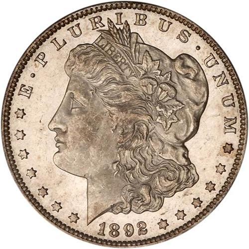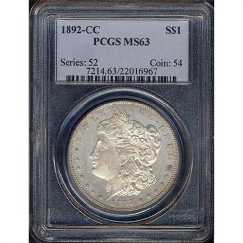 <b>1892-CC Morgan Dollar. PCGS graded MS63.</b> Easily the most visually arresting feature of this coin is its soft, frosted mint luster typical of the desirable Carson City mint coinage. Choice swirling luster on both sides, it is. Extra crisp detail on all relief portions, also, with only the standard lack of clarity at the exact centers (which are the high points of the design) <b>(PCGS # 7214)</b>