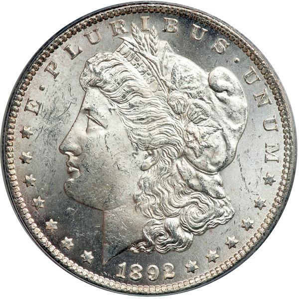 1892-CC Morgan Dollar. PCGS graded MS-64. Mostly white with light gold tone on the reverse. Far in advance of most CC dollars, this was struck with systematic exactness including (not excepting) the usual weak areas in the centers (PCGS # 7214) .