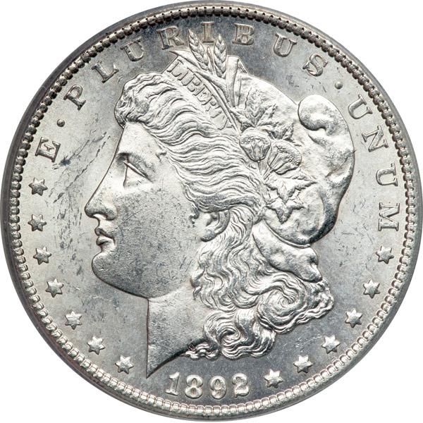 1892-CC Morgan Dollar. PCGS graded Genuine. Our grade is MS60 with a few light hairlines (PCGS # 7214) .