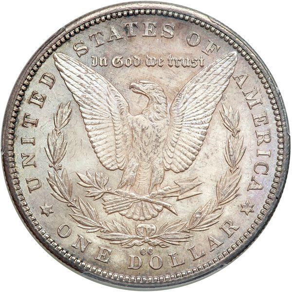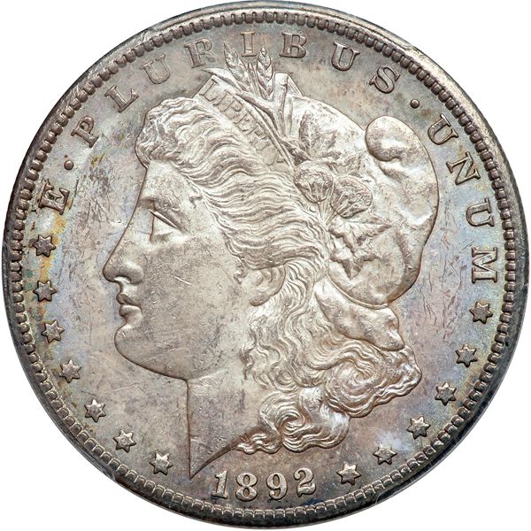 1892-CC Morgan Dollar. PCGS graded MS-63. Lovely light blue toning; some modest bagmarking but overall a lustrous, frosty example. Second to the last issue from this far Western mint, whose days were numbered once Grover Cleveland won the presidental election in November of that year. As before in 1885 upon entering office in his unique split double-term as President, Cleveland would once again sign the closure documents ending Carson City's facinating but short-lived existence as a Mint, 1870-93 (PCGS # 7214) .