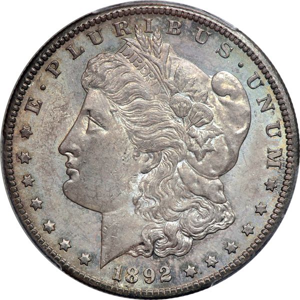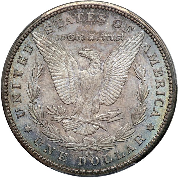 1892-CC Morgan Dollar. PCGS graded MS-63. Lovely blue and gold toning with reflective fields with choice appearance over both sides (PCGS # 7214) .