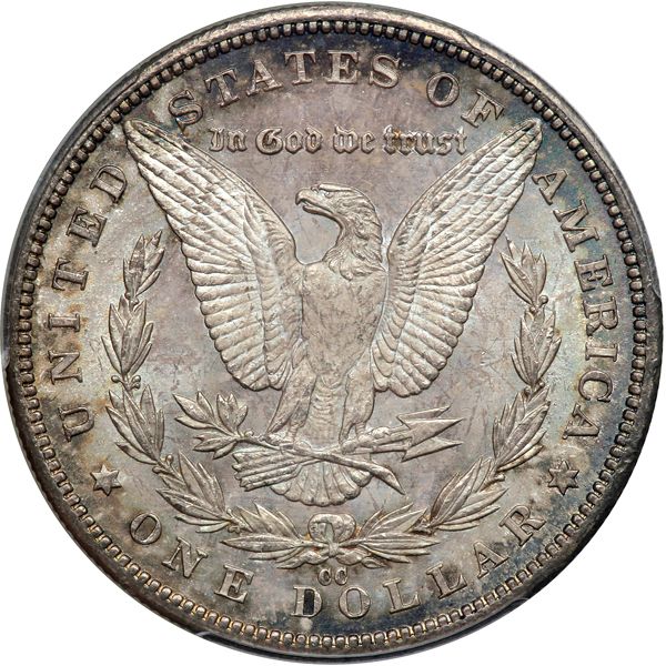 1892-CC Morgan Dollar. PCGS graded MS-63. Blue and gold toning with semi-reflective fields on both sides. Well struck with all the finer detail present (PCGS # 7214) .
