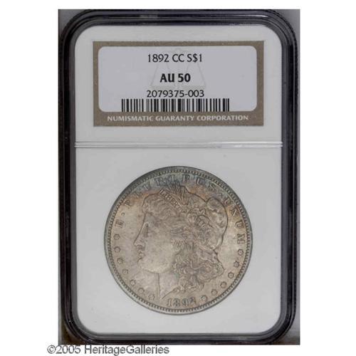 <B>1892-CC<S$1> AU50 NGC.</B></I> Bluish-golden toning is noted on this moderately circulated branch mint issue. Much of the original luster is still present.