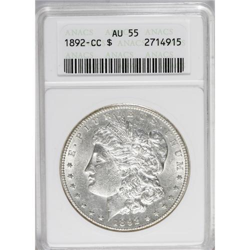 <B>1892-CC S$1 AU55 ANACS.</B></I> An untoned slider with extensive luster and a mere hint of friction on the eagle's breast. The strike is incomplete near the claws, and the cheek near the ear is moderately abraded.<BR><BR><b>Shipping:</b> Coin/Currency (<a target="_blank" href="http://www.heritageauctions.com/common/shipping.php">view shipping information</a>)