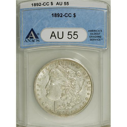 <B>1892-CC S$1 AU55 ANACS.</B></I> Silver-gray surfaces display ample luster and minimal marks. Some of the usual softness is seen in the hair over Liberty's ear.<BR><I>From The Edward Sacks Collection.</B></I><BR><BR><b>Shipping:</b> Coins & Currency (<a target="_blank" href="http://www.heritageauctions.com/common/shipping.php">view shipping information</a>)