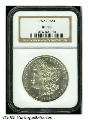 <B>1892-CC<S$1> AU58 NGC.</B></I> With overall sharp definition and few outwardly distracting handling marks, this coin would fit nicely into a high grade circulated set. Mostly silver-gray in sheen.