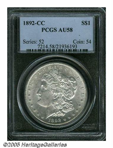 <B>1892-CC<S$1> AU58 PCGS.</B></I> A hint of friction is detected on the hair above the ear, nonetheless, the mint luster is essentially complete on this lightly toned and problem-free better date Carson City Silver Dollar.