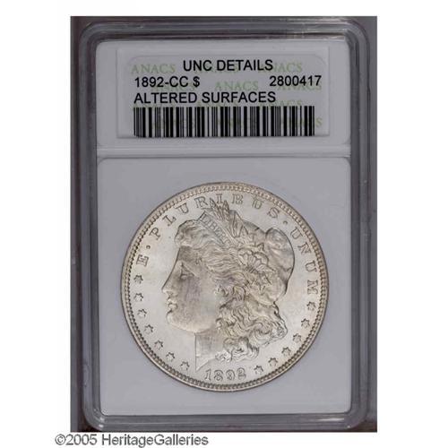 <B>1892-CC<S$1>--Altered Surfaces--ANACS. Unc. Details.</B></I> A lustrous and smooth tough date CC-mint Dollar with light apricot-gold toning. The hair above the ear is not crisp, but the strike is otherwise attentive. The portion of the cheek below the eye has curious steel-gray color and a minutely matte texture, hence the ANACS designation. The second C in the mintmark is nicely repunched.