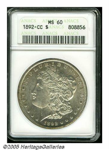 <B>1892-CC<S$1> MS60 ANACS.</B></I> Sharply struck and fully lustrous with satiny fields. This is an extremely attractive example for the grade with just a hint of toning on each side.<BR><I>From The Stig Ericsson Collection.</B></I>