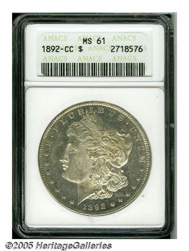 <B>1892-CC<S$1> MS61 ANACS.</B></I> Most Mint State 1892-CC dollars are heavily bagmarked and exist in lower grade levels from MS60 to MS62. The MS61 coin offered here has just a few wispy handling marks, especially in the fields, but none are individually serious or detracting. Light tan patina is noted on portions of Liberty. Partially prooflike fields present a noticeable contrast with the sharply struck devices.